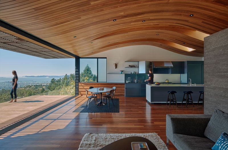 Inside, the wood ceiling curves overhead, echoing the hillside beyond. Its long linear sections draw the eye outward to the balcony, where glass railings preserve the open view. The living room features a dramatic hanging fireplace, while pocketing glass doors disappear into the wall to extend the space toward the outdoors.