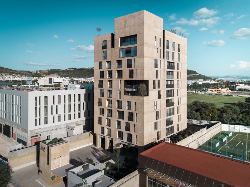 AIRA Located in one of the most extensively developed areas in the north of the city of Querétaro, and 100m from one of the principal avenues, AIRA is a tower of 35 apartments. The project is located on a narrow and deep site measuring 2,100 m2. Its compact volumetry reflects the intention to generate open space and to create green areas and offers a forceful vertical response to an area dominated by horizontal architecture.