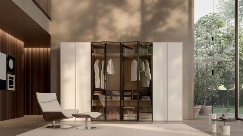 Complementing the Alterna wardrobes, the Flexy walk-in closet system integrates into the SpaceMakers Night series. This modular system transforms storage into an architectural element, acting as a container in which to place the Alterna wardrobes and a series of other designs: for example, the Trend island dresser from the brand, shown in walnut and transparent smoky glass for the product’s presentation.