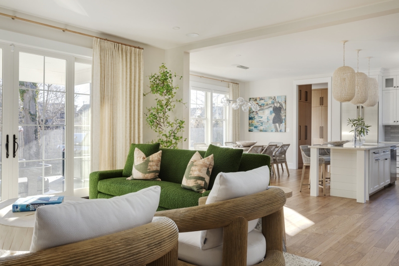 In the bedrooms, the clients’ sentimental artwork was carefully reframed to give each piece a fresh, modern presence that complements the new design. Natural materials like wicker and rattan, gentle pops of green, and softly curved furniture tie the rooms to the coastal surroundings. These thoughtful choices create spaces that feel both personal and inviting, adding warmth and character throughout the home.