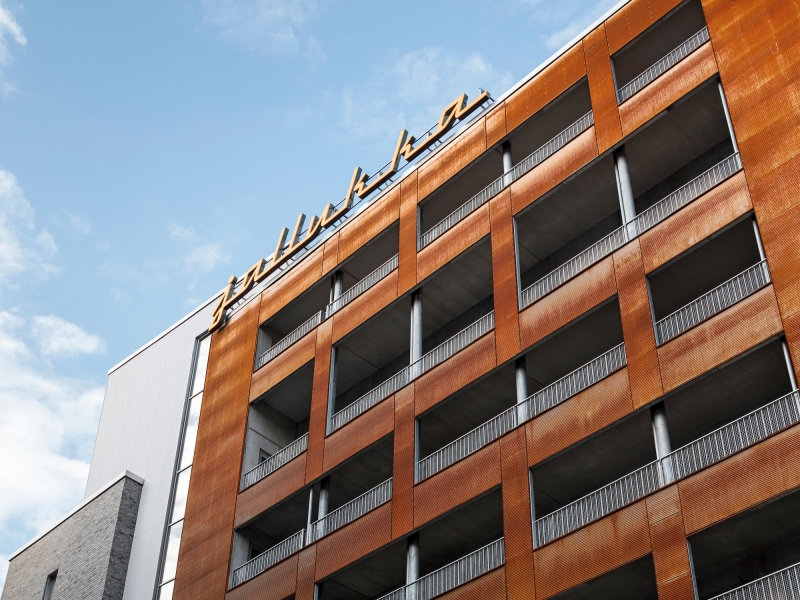 Both the interiors of the apartments as well as the exterior of the building have a strong material sense. For example, the concrete surface of the partitions between the flats is left bare. The choice to use straight-forward materials is partly justified by aiming for reasonable-cost housing. The alley-side facade is of light grey handmade brick whereas the recessed top floors are covered with profiled aluminium sheeting. The musicians’ wing is enveloped in corten steel – bringing to mind the colour of Jaloviina, a Finnish cut brandy often favoured by rockers.