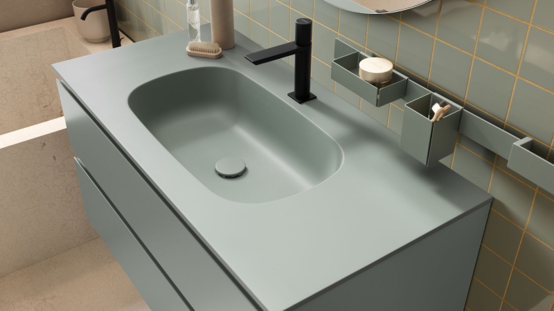 There is the Giada matt lacquer version with Quick 50 washbasin, Raggio mirror, and Arco lamp, where fresh tones meet formal simplicity; or the Poronoce Latte finish, paired with Cubo washbasins in Matt Tortora ceramic and Canapa handles, conveying warmth and natural balance. For those seeking a more distinctive mood, the Mattone matt lacquer and Rosa Quarzo composition with open compartment and Slim glossy ceramic washbasin expresses delicate modernity. The Poronoce Nazionale variant, with Titanio handle, Quick 45 Canapa washbasin with off-center drain, and Essenze column with push-pull opening, offers a more classic and reassuring atmosphere.