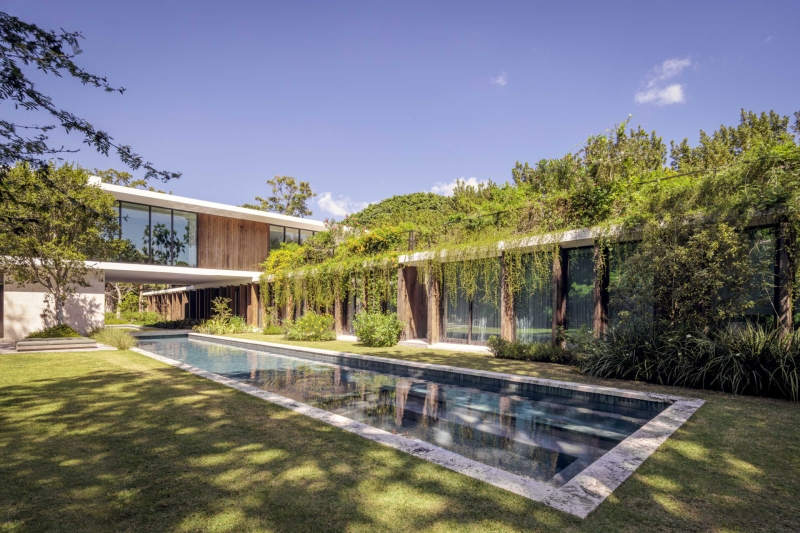 A long pool is positioned beneath the upper volume and runs parallel to the private areas of the home, while overhanging plants soften the architecture.