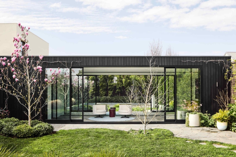 The restored facade and verandah anchor the home in its Victorian heritage, while a new rear addition projects it firmly into the present. Dark-stained timber, expansive glazing, and a simplified roofline define the modern extension, offering a striking contrast to the ornate front.